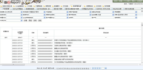 中國進出口銀行新一代報表系統的數據來源于各務系統,包括信貸、國結、資金、會計、財管等,通過分析各業務系統之間的關系,并輔助以數據的補錄,通過數據倉庫的思想整合出符合"中國進出口銀行新一代報表系統"要求的5大主題群,分別為"總賬"、"信貸"、"國結"、"資金"、"存款",各主題群之間即可相互獨立,也可相互關聯,通過各主題群的應用,完成了"1104報表生成和報送"、"人行報表報送"、"外管局報表報送"、"銀監會報表報送"、"行內各報表的查詢和報送"、"客戶風險管理"以及"統計工作考評"等應用模塊。