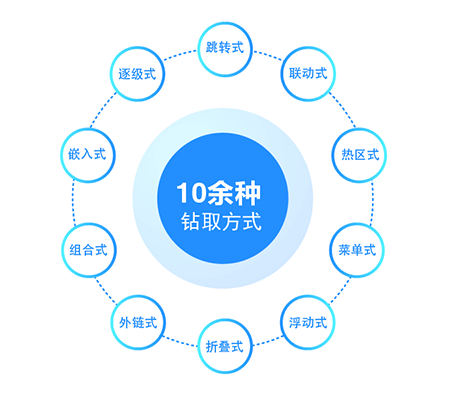 提供了十余種鉆取方式,并采用向?qū)降亩x,鉆取方式包括:逐級(jí)式、跳轉(zhuǎn)式、聯(lián)動(dòng)式、熱區(qū)式、菜單式、浮動(dòng)式、折疊式、外鏈?zhǔn)健⒔M合式、嵌入式等。