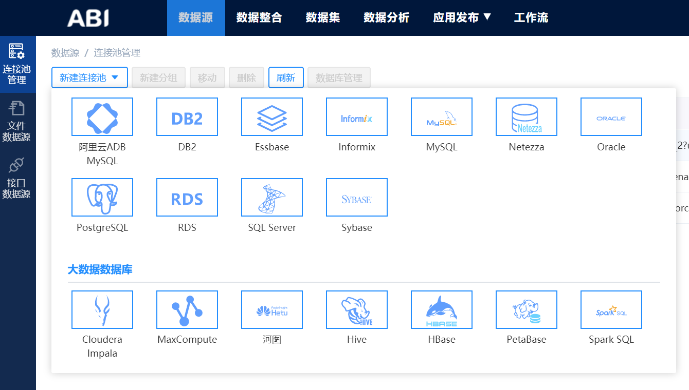 第一步,就是對(duì)接數(shù)據(jù)庫,億信ABI支持對(duì)接包括:Mysql、Oracle、SQL Server、DB2、GBase、PetaBase、Essbase等多種數(shù)據(jù)庫,而且還支持各種其他類型文件的導(dǎo)入數(shù)據(jù),包括excel、txt、csv、db等等文件。