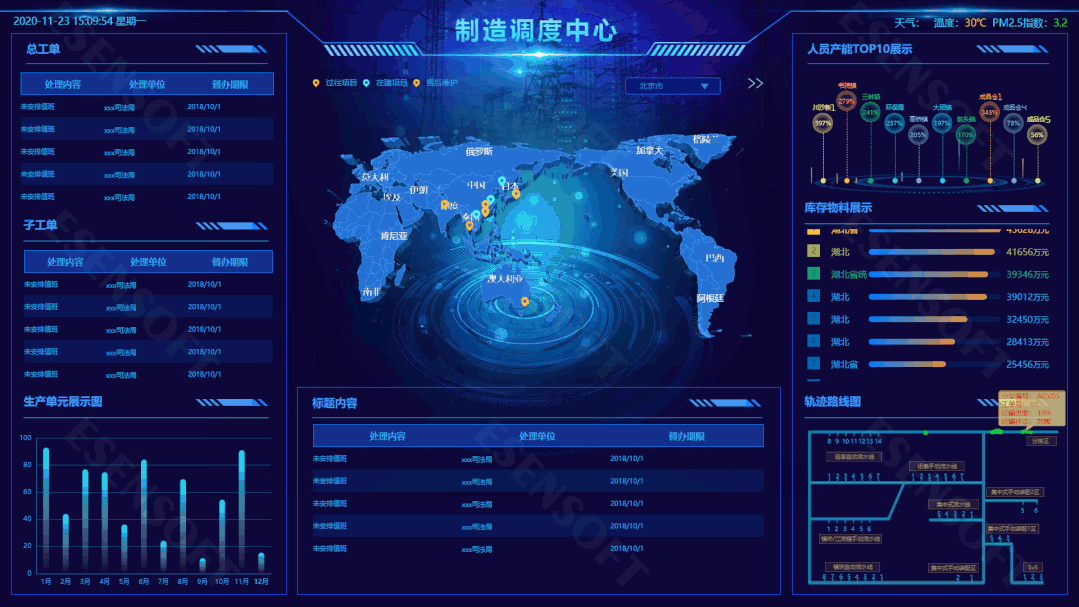 —TOP 4— 制度調(diào)度大屏 最佳分辨率:1920*1080 使用場景:工業(yè)4.0時(shí)代,制造業(yè)也開始積極響應(yīng)產(chǎn)業(yè)數(shù)字化的號召,融合大數(shù)據(jù)分析、3D地圖等技術(shù),構(gòu)建體系先進(jìn)、功能強(qiáng)大、場景豐富的制造調(diào)度指揮系統(tǒng),滿足了生產(chǎn)調(diào)度、應(yīng)急指揮、遠(yuǎn)程指揮、綜合決策以及企業(yè)宣傳等多種應(yīng)用場合。 展現(xiàn)邏輯:通過世界地圖一覽在建及歷史項(xiàng)目的運(yùn)轉(zhuǎn)狀態(tài),方便售后維護(hù);另外對于制造中心內(nèi)的總工單、子工單、物料消耗、人員產(chǎn)能等指標(biāo)進(jìn)行充分直觀地展現(xiàn)。