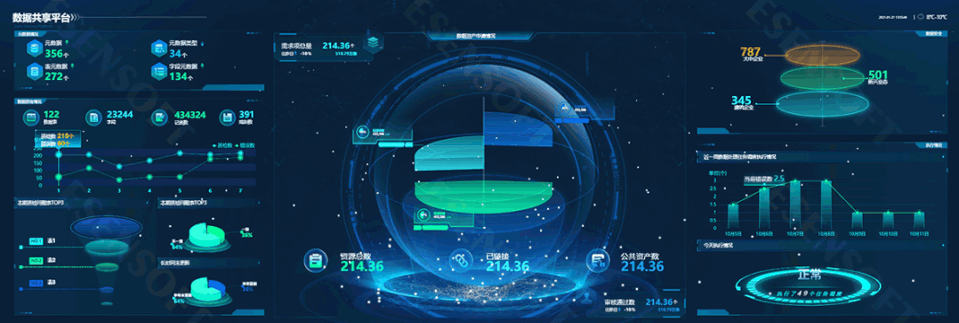 展現(xiàn)邏輯:實(shí)時(shí)展示數(shù)據(jù)資產(chǎn)申請情況、元數(shù)據(jù)情況、數(shù)據(jù)質(zhì)檢情況、數(shù)據(jù)安全、執(zhí)行情況等信息,并添加大量的動(dòng)畫效果使其充滿科幻感。