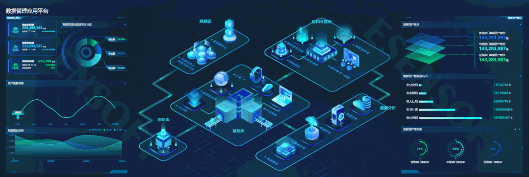 展現(xiàn)邏輯:中心以動(dòng)畫效果展示數(shù)據(jù)管理應(yīng)用的整個(gè)流程,實(shí)時(shí)展示數(shù)據(jù)接入情況、數(shù)據(jù)增長趨勢、數(shù)據(jù)資產(chǎn)概況等信息。