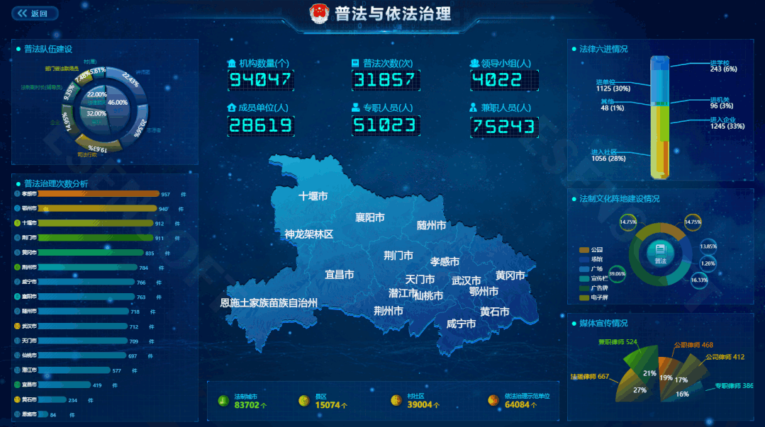 —TOP 2— 法制宣傳大屏 最佳分辨率:1920*1080 使用場景:了解普法工作的推進(jìn)情況,包括隊(duì)伍建設(shè)、媒體宣傳、各個(gè)縣市的大數(shù)據(jù)對比等,對于有法制宣傳,法律服務(wù)等需求的行業(yè)提供大屏承載方案,助其成為暢通社情民意、服務(wù)保障民生的監(jiān)管新陣地。 展現(xiàn)邏輯:使用樣式各異的圖表,展示法律行業(yè)內(nèi)的不同需求的數(shù)據(jù),根據(jù)地理位置等信息數(shù)據(jù),直觀、便捷的展現(xiàn)數(shù)據(jù)結(jié)果,讓人一目了然。